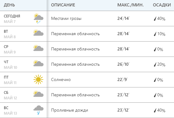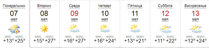 Сайт Gismeteо прогнозирует осадки 7-8 мая. Самым теплым днем недели станет среда, 9 мая, когда потеплеет до +27. Затем немного похолодает до +19...+23 днем. Без осадков.