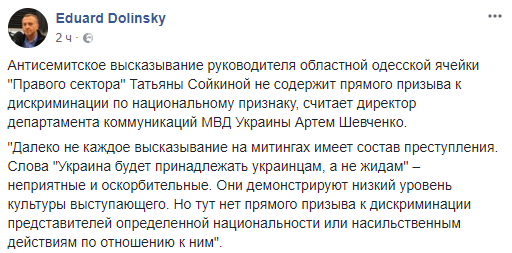 В соцсети пользователи обсуждают комментарий директора департамента коммуникаций МВД Артем Шевченко, который заявил, что антисемитское высказывание главы одесской ячейки "Правого сектора" не содержит прямого призыва к дискриминации по национальному признаку.