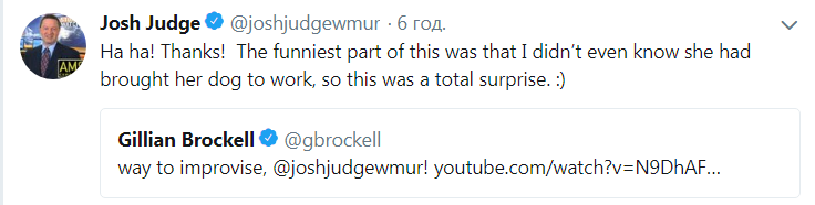 Джадж выяснил у коллеги кличку собаки: ее зовут Белла. Животное просто прошло по студии, не обратив на ведущего особого внимания.