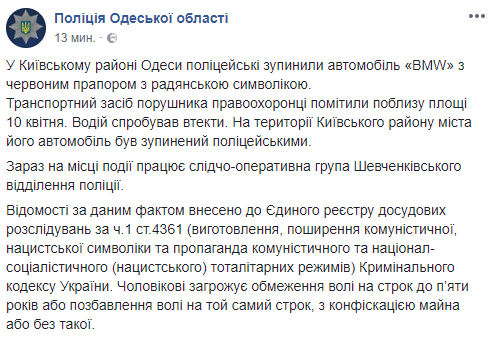 Сведения по данному факту внесены в Единый реестр досудебных расследований по ч.1 ст.4361 (изготовление, распространение коммунистической, нацистской символики и пропаганда коммунистического и национал-социалистического (нацистского) тоталитарных режимов) Уголовного кодекса Украины.