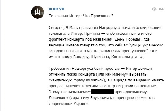 "Сегодня, 9 Мая, правые из Нацкорпуса начали блокирование телеканала Интер. Причина — опубликованный в инете фрагмент концерта под названием "День Победы", где ведущие Интера говорят о том, что сейчас "улицы украинских городов называют в честь фашистских преступников". Они имеют ввиду Бандеру, Шухевича, Коновальца и т.д, - говорится в сообщении на телеграм-канале Нацкорпуса. - Сегодня Интер объявил открытую войну украинским националистам. С нашей стороны будут ответные действия. Анонсов не будет - будут удары".