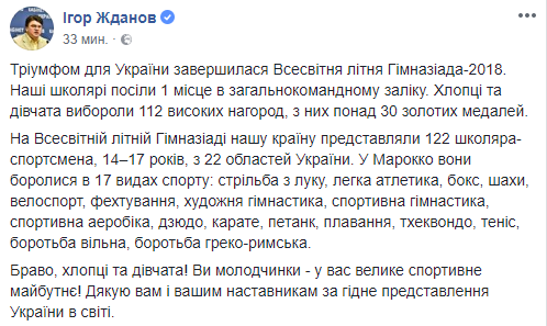 "Триумфом для Украины завершилась Всемирная летняя Гимназиада--2018. Наши школьники заняли 1 место в общекомандном зачете. Ребята завоевали 112 высоких наград, из них более 30 золотых медалей", - написал министр.