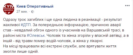 Как сообщает очевидец на странице "Киев оперативный " в Facebook, мужчина и женщина сгорели в собственном автомобиле, а в другой  машине - от травм скончался водитель-мужчина, а женщина в больнице.