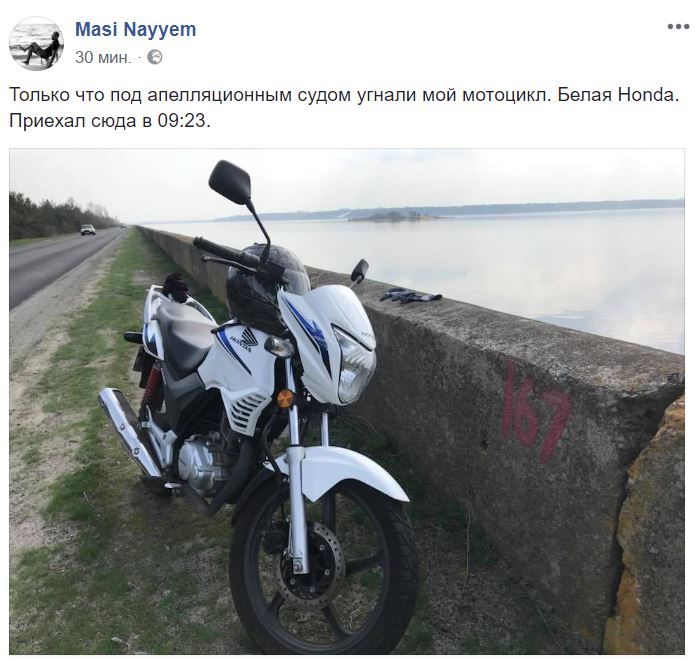 "Только что под Апелляционным судом угнали мой мотоцикл. Белая Honda. Приехал сюда в 09:23", - заявил Найем.