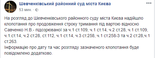 "На рассмотрение в Шевченковский районный суд города Киева поступило ходатайство о продлении срока содержания под стражей в отношении Савченко Н.В.", -  говорится в сообщении.
