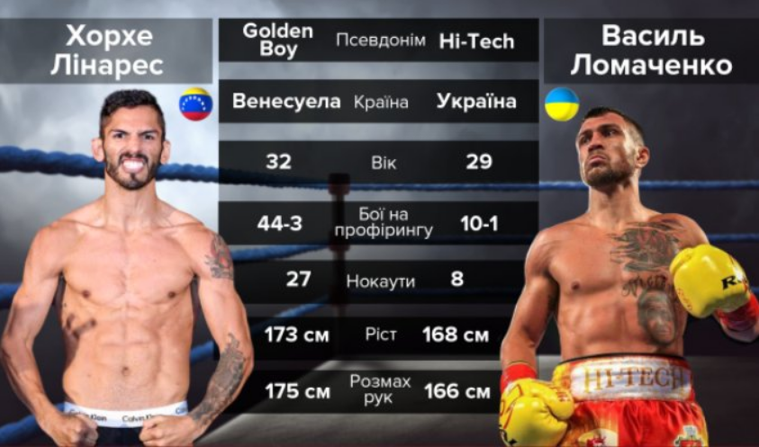 Для украинца нынешний бой станет дебютным в легком весе (до 61.2 кг). Промоутер Ломаченко - Боб Арум заявил, что пока можно лишь догадываться о возможностях нашего боксера в новой для него категории. С другой стороны, Хорхе Линарес не знает поражений в этом весе с 2012 года.