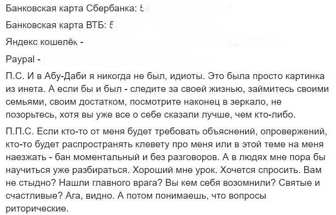 "Опровергать ложь и клевету я не собираюсь. Это ниже меня. Мне брезгливо все это. Мне брезгливы все эти люди. Презираю. И да. Вот мои реквизиты, если кто-то считает нужным и возможным меня поддержать. Меня и мою многолетнюю деятельность на ниве контрпропаганды, если кого-то не оставляют равнодушными моими тексты и кто-то может быть считает, что травить людей – это нехорошо, то буду благодарен: