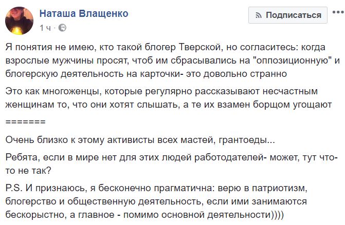 "Это как многоженцы, которые регулярно рассказывают несчастным женщинам то, что они хотят слышать, а те их взамен борщом угощают. Очень близко к этому активисты всех мастей, грантоеды...Ребята, если в мире нет для этих людей работодателей- может, тут что- то не так? P.S. И признаюсь, я бесконечно прагматична: верю в патриотизм, блогерство и общественную деятельность, если ими занимаются бескорыстно, а главное – помимо основной деятельности", – пишет Влащенко.