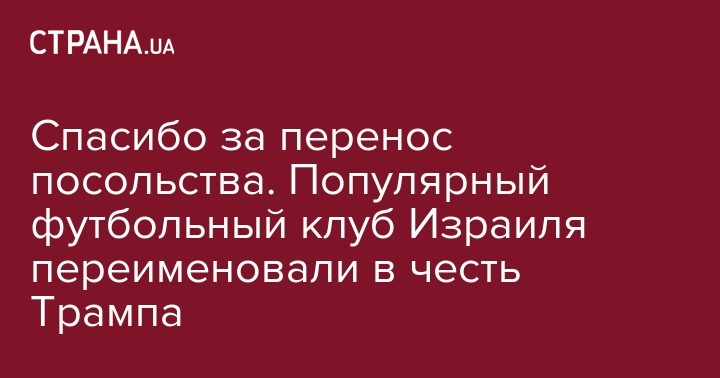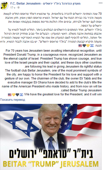 Таким образом футболисты высказали благодарность американскому лидеру за решение перенести американское посольство в Иерусалим. Теперь футбольный клуб носит название "Бейтар Трамп Иерусалим". Об этом сообщается на его странице в Facebook.