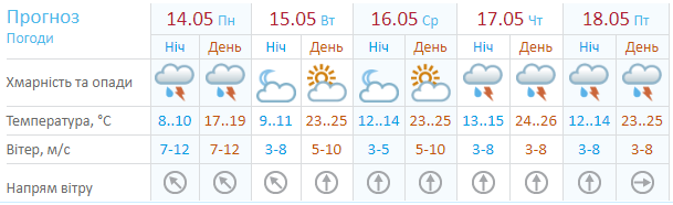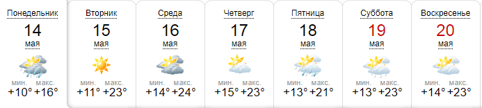 По данным сайта Sinoptik.ua обещает дождь в понедельник, пятницу и субботу. Самым холодным днем недели будет понедельник, 14 мая, до +16 днем. Далее в дневное время воздух прогреется до +21...+24.