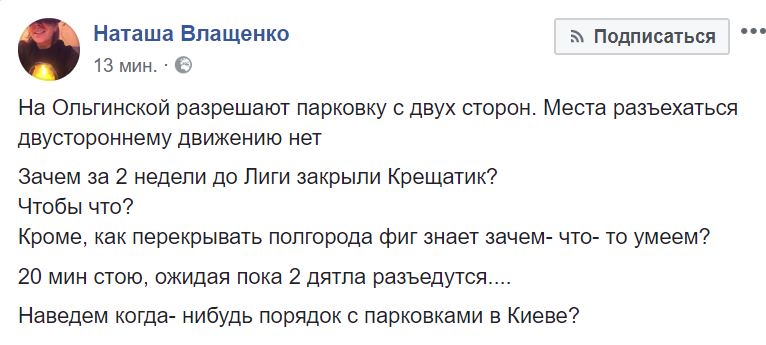 "Я искренне поздравляю с большим успехом всех ответственных за организацию мероприятий к финалу Лиги чемпионов и дорожного движения города Киева. Закрыть Крещатик при одновременном ремонте Набережного шоссе и наглухо перекрытой Сагайдачного – это инновация и смелый эксперимент над городом. Киевляне точно подадут вас на премию. Дарвина", – написал народный депутат Владимир Арьев.