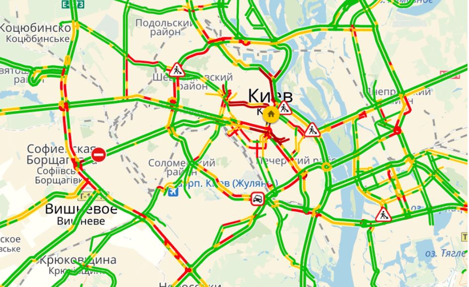 Из-за всего этого столица стала в сплошной пробке. К вечеру движение также остается затрудненным на улицах Саксаганского, Владимирской, бульварах Леси Украинки, Тараса Шевченко и Дружбы народов, пробки к 18:00 достигают 8 баллов. А к 19:00 – и все 9.