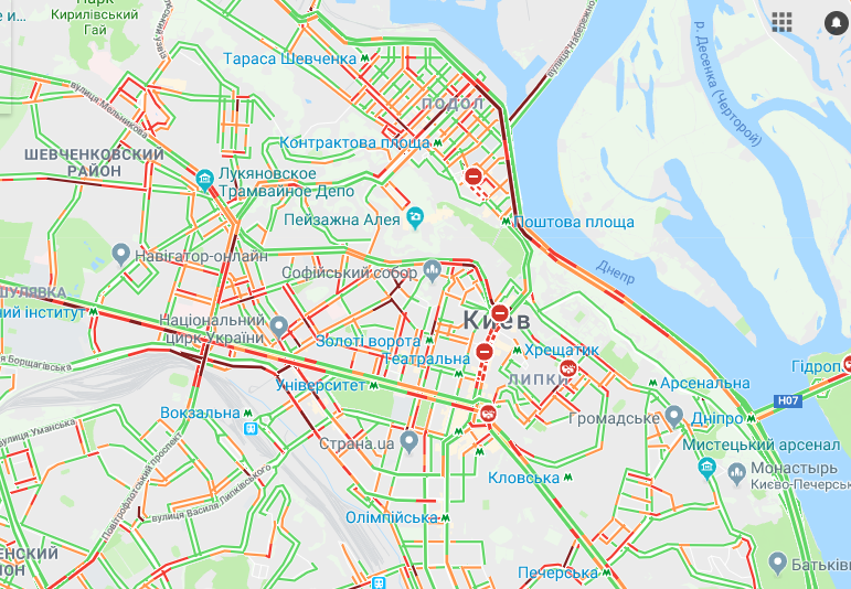 В центре пробки возле метро "Университет", "Театральная", "Кловская", "Дворец Украина", "Почтовая площадь" и "Политехнический Институт".