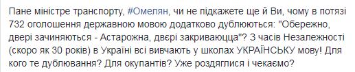 "Господин министр транспорта Омелян, не подскажете еще и вы, почему в поезде 732 объявления на государственном языке дополнительно дублируются "Осторожно, двери закрываются"? Со времен независимости (скоро 30 лет) в Украине все изучают в школах украинский язык! Для кого это дублирование? Для оккупантов? Уже разделись и ждем?" – поинтересовалась Ницой.