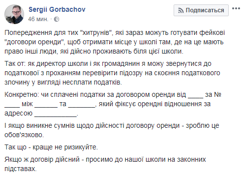 "Предупреждение для тех "хитрецов", которые сейчас могут готовить фейковые "договоры аренды", чтобы получить место в школе там, где на это имеют право другие люди, которые действительно проживают у этой школы.