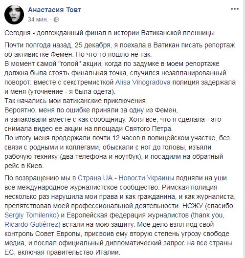 Как сообщала "Страна", появилось видео, как журналиста "Страны" задержали в Ватикане. Это произошло в Ватикане, около 11 утра, в ходе акции Femen.