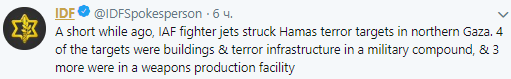 "Удары были нанесены по семи объектам" Хамас "на севере Сектора Газа, четыре из которых - здания и террористическая инфраструктура, и три - фабрики по изготовлению оружия", - говорится в сообщении армии Израиля.