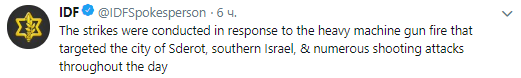 Как сообщает пресс-служба Армии обороны Израиля в Twitter удар был нанесен по объектам группировки "Хамас" в ответ на пулеметный огонь.