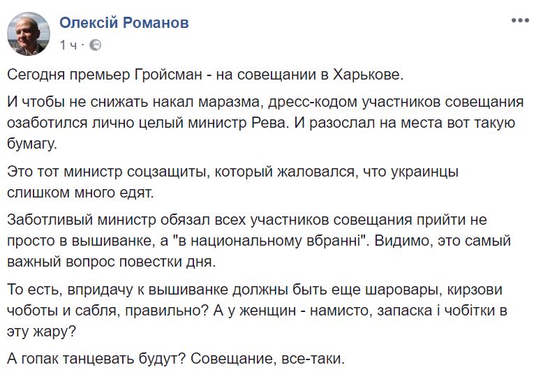 "Сегодня премьер Гройсман - на совещании в Харькове. Дресс-кодом участников совещания озаботился лично целый министр Рева. И разослал на места вот такую бумагу. Заботливый министр обязал всех участников совещания прийти не просто в вышиванке, а "в национальному вбранні". Видимо, это самый важный вопрос повестки дня. То есть, впридачу к вышиванке должны быть еще шаровары, кирзови чоботы и сабля, правильно? А у женщин - намисто, запаска і чобітки в эту жару? А гопак танцевать будут? Совещание, все-таки", - написал Романов.