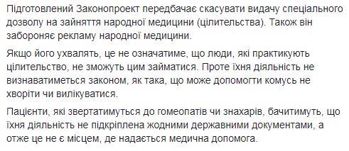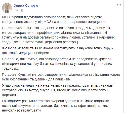 "Если современная медицинская наука не признает практику целителей, знахарей и экстрасенсов как метод лечения, этого не может признавать закон и государство. И в любом случае Министерство здравоохранения не может предоставлять разрешительные документы на методы, безопасность и эффективность которых невозможно гарантировать. Подготовленный законопроект предполагает отменить выдачу специального разрешения на занятия народной медициной (целительством). Также он запрещает рекламу народной медицины", - написала Супрун.
