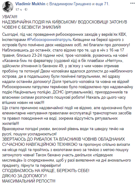 На территории Киевского водохранилища (КВХ) затонула лодка с тремя мужчинами на борту. Один из них пропал без вести. Об этом на своей странице в Facebook написал начальник Киевского рыбоохранного патруля Владимир Мухин.