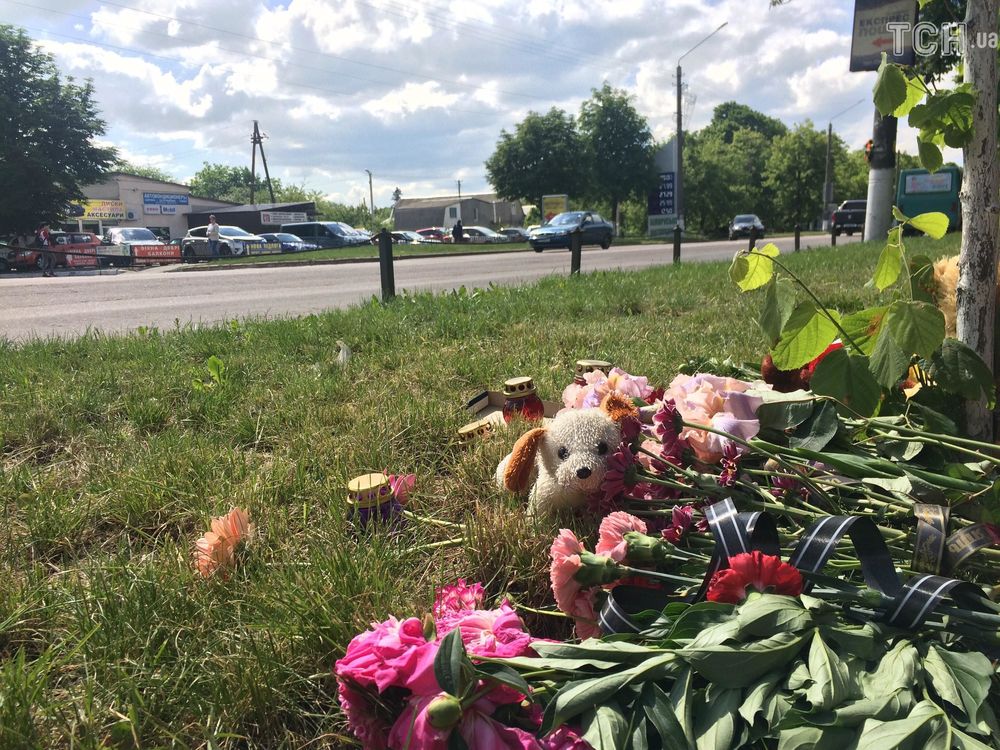 Люди несут цветы и игрушки на место ДТП с девочками на роликах в Борисполе