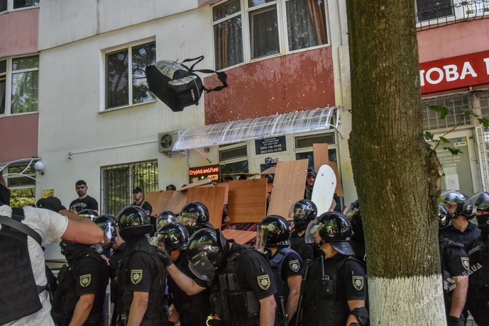 Радикалы начали забрасывать офис, рядом с которым находились другие компании (например, "Новая почта"), яйцами,  картошкой и помидорами. Часть этих "боеприпасов" попала в правоохранителей. Один из майдановцев был задержан, но потом отпущен на свободу.