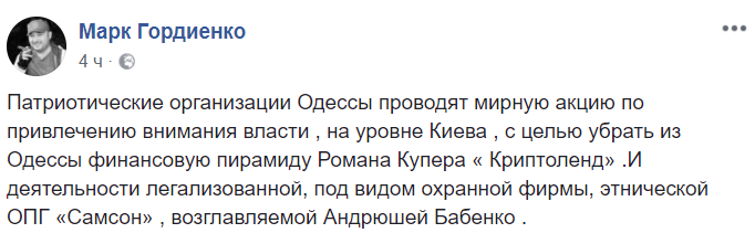 "Патриотические организации Одессы проводят мирную акцию по привлечению внимания власти, на уровне Киева, с целью убрать из Одессы финансовую пирамиду Романа Купера "Криптоленд". И деятельности легализованной, под видом охранной фирмы, этнической ОПГ "Самсон" , возглавляемой Андрюшей Бабенко".