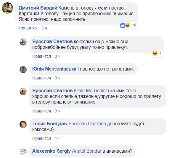 "Вместо этого, как оказалось, они применяли картофель, яйца и помидоры. По мнению активистов, массированный обстрел учреждения этими продуктами питания должен привлечь внимание общества и правоохранительные органы к вопросам, которые они поднимают", – пишет в довольно оправдательном тоне советник главы одесской полиции.