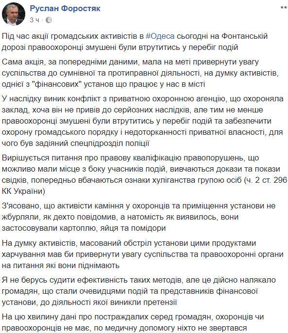 После событий на Фонтанской дороге советник главы одесской полиции Руслан Форостяк написал пространный пост в Facebook, который звучит как минимум сочувственно в отношении к тому, что делали активисты Марка Гордиенко.