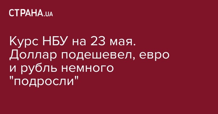 В среду, 23 мая, Национальный банк Украины установил официальный курс гривны по отношению к иностранным валютам. По сравнению с предыдущим рабочим днем, когда регулятор уставнавливал официальные курсы валют, доллар подешевел на 1 копейку, а евро и рубль прибавили в цене.