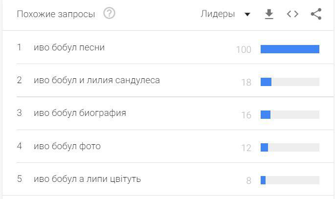 Песня "А липи цвітуть" также является лидером в рейтинге поиска Google - из всех песен Бобула украинцы чаще всего ищут именно ее.