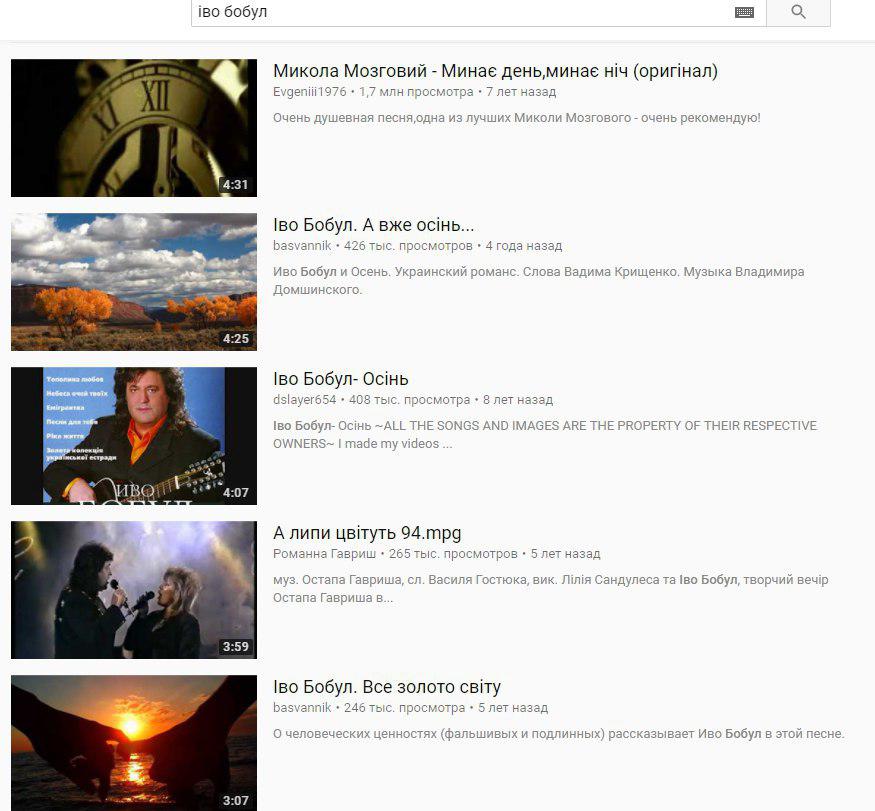 Так, на YouTube самыми популярными являются песни "Минає день, минає ніч" авторства Николая Мозгового, песня "Осінь" и дуэт Иво Бобула с Лилией Сандулесой "А липи цвітуть".