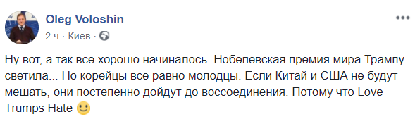 "Ну вот, а так все хорошо начиналось. Нобелевская премия мира Трампу светила... Но корейцы все равно молодцы. Если Китай и США не будут мешать, они постепенно дойдут до воссоединения", - не теряет оптимизма международник Олег Волошин.