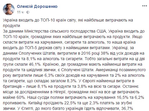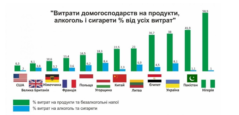 "Наши соседи поляки тратят на питание 16,5% и 6,2% пропивают. Китайцы проедают 22,5% и еще 2,3% платят за пагубные привычки. В Египте, к которому многие украинцы ездят отдыхать, 36,7% доходов тратится на еду и 4,5% на табак. Как сказал бы один известный человек в нашей стране – больше украинцев любят есть и пить только нигерийцы, кенийцы и камерунцы. Но только за счет питания, поскольку затраты на горячительные напитки и курение в них в разы меньше", - подчеркивает он.