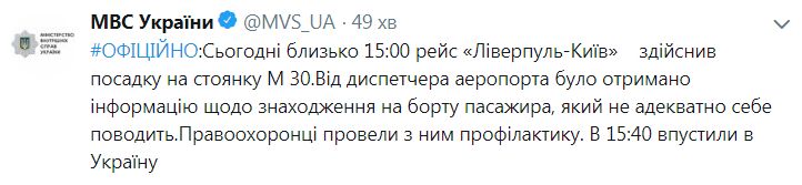 "Сегодня около 15:00 рейс "Ливерпуль-Киев" совершил посадку на стоянку М 30. От диспетчера аэропорта была получена информация о нахождении на борту пассажира, который неадекватно себя ведет. Правоохранители провели с ним профилактику. В 15:40 впустили в Украину", - говорится в опубликованном сообщении, обнародованном в официальном Твиттер-аккаунте МВД Украины в пятницу вечером.