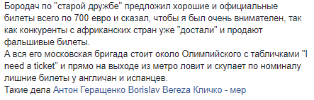 По словам Степурина, официальные билеты продаются по 700 евро с табличками "I need а ticket" у НСК "Олимпийский", а лишние билеты скупаются у англичан и испанцев.
