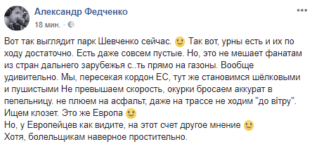 По словам Федченко, в парке достаточно урн, однако весь мусор европейцы бросали под ноги. Он пишет, что в парке есть даже совсем пустые урны.