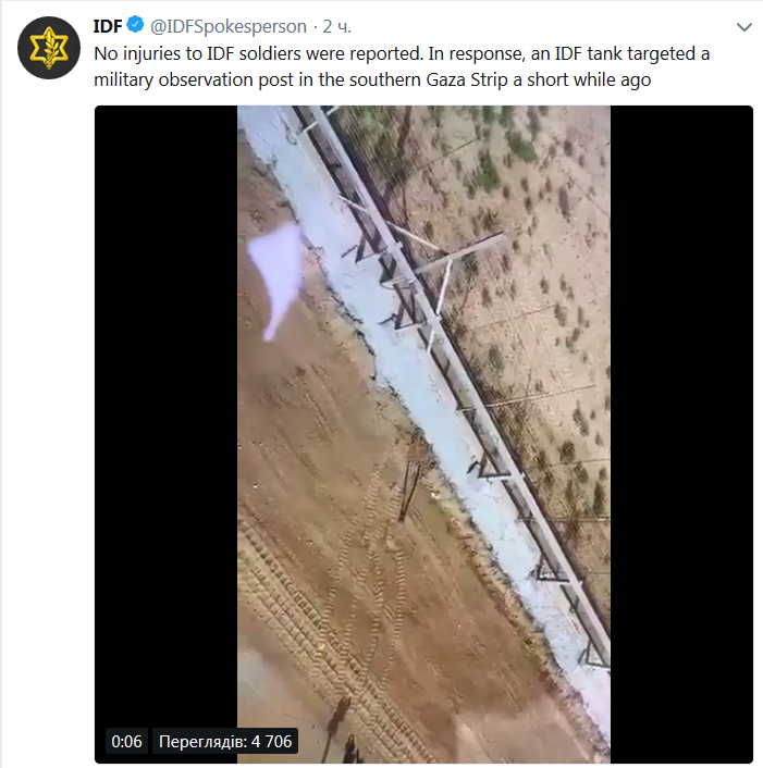 Об этом в Twitter сообщает пресс-служба Армии обороны Израиля.