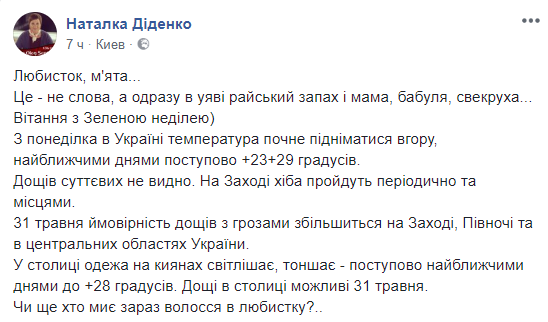 Об этом сообщает украинский синоптик Наталья Диденко на своей странице в Facebook.