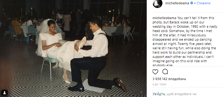 "По фото не скажешь, но в день нашей свадьбы в октябре 1992 года Барак проснулся с ужасным насморком. А еще каким-то чудесным образом он исчез у алтаря, но потом мы танцевали почти всю ночь. Двадцать пять лет спустя мы все еще веселимся, но также ведем колоссальную работу, чтобы поддерживать друг друга как личностей. Я не могу представить себя с кем-то другим", - написала в соцсети Мишель Обама.