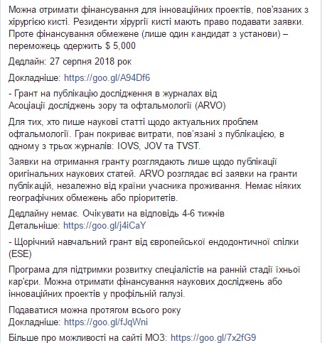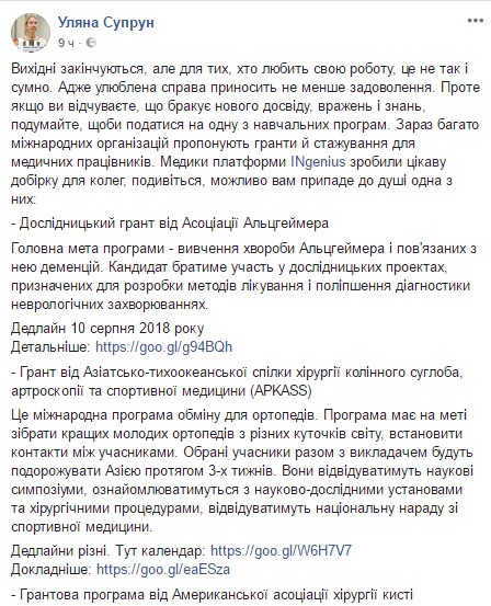 Какие международные организации предлагают гранты и стажировки для медицинских работников из Украины, рассказала на своей странице в Facebook и.о. министра здравоохранения Ульяна Супрун.