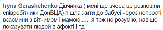 "Девочка (мне еще вчера это рассказали сотрудники ДонВГА) ушла жить к бабушке из-за непростых взаимоотношений с отчимом и мамой. Я тоже не понимаю, зачем показывать людей в аффекте", – написала она.