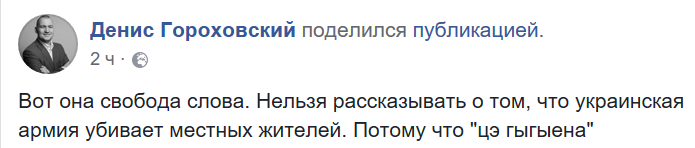 "Вот она, свобода слова. Нельзя рассказывать о том, что украинская армия убивает местных жителей. Потому что "цэ гыгыена", – пишет блогер Денис Гороховский.