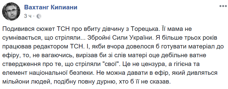 "Посмотрел сюжет ТСН об убитой девушке из Торецка. Ее мама (на самом деле бабушка. – Прим. ред.) не сомневается, что стреляли ... Вооруженные Силы Украины. Я более трех лет работал редактором ТСН. И, если бы вчера пришлось готовить материал к эфиру, то, не колеблясь, вырезал бы из слов матери это дебильное ватное утверждение о том, что стреляли "свои".