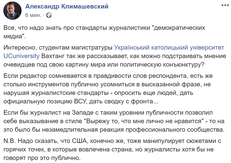 N.B. Надо сказать, что США, конечно же, тоже манипулирует сюжетами с горячих точек, в которые вовлечена страна, но журналисты хотя бы не говорят про это публично", – пишет медиаэксперт Александр Климашевский.