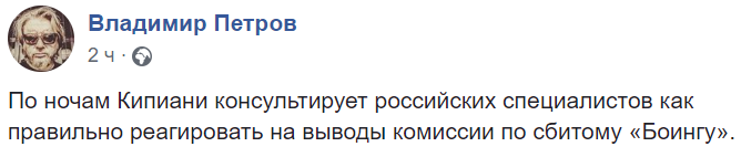 "По ночам Кипиани консультирует российских специалистов, как правильно реагировать на выводы комиссии по сбитому "Боингу", – иронизирует шоумен Владимир Петров.