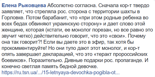 "Абсолютно согласна. Сначала корреспондент твердо заявляет, что стреляла российская сторона с территории шахты в Горловке. Потом барабанит, что "при этом родные ребенка во всех бедах обвиняют украинскую сторону", и дает слово этой женщине, которая (кстати, ее монолог порезан, но все равно это звучит четко) действительно говорит, что это "свои". Почему она так говорит?! Если вы даете это в эфир, так хотя бы прокомментируйте! Но они тупо дают этот монолог, и кор-т опять завершает декларацией, что это "теракт пророссийских боевиков". Поразительно".