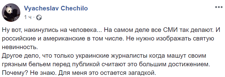 Другое дело, что только украинские журналисты, когда машут своим грязным бельем перед публикой, считают это большим достижением. Почему? Не знаю. Для меня это остается загадкой", – говорит журналист Вячеслав Чечило.