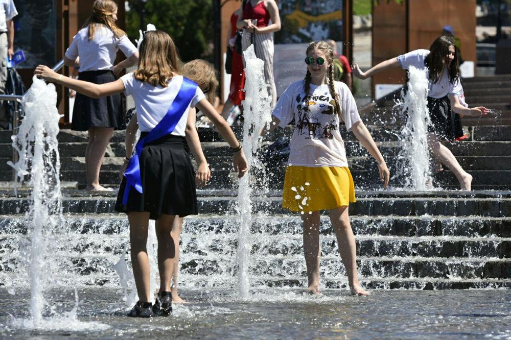 Выпускники, которые закончили 11 класс, по негласной традиции после школьной линейки идут нарядные в центр города и купаются в фонтанах, фото: Аркадий Манн, "Страна"